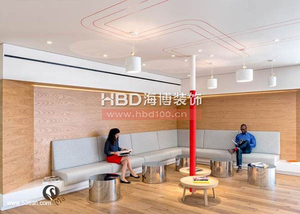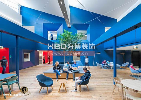 接下來廣州裝修公司海博裝飾小編帶你來看一組國外辦公室裝修純色劃分空間設計的案例,通過純凈的色彩來進行空間隔斷,劃分出不同的功能區域。如下圖的辦公空間,藍色是各個部門的會客區、紅色區域設計為休息兼走廊、灰色與白色區域為工作區域。整個空間使用顏色劃分區域來看,工作區顯得更為常態,而展示給客戶的區域在用色上更為大膽。